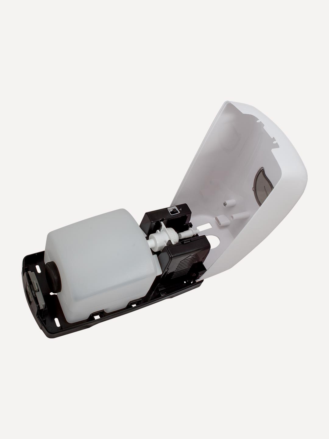 Es un dosificador automático de jabón líquido a granel, con posibilidad de convertirse en jabonera de espuma, cambiando la válvula. Capacidad de 1 litro. Esta jabonera puede dosificar cualquier tipo o marca de jabón líquido, o en su defecto, jabón espuma, para manos a granel. Su mecanismo se activa a través de un sensor que detecta cuando la persona coloca la mano bajo el despachador. Dosifica aproximadamente 1 ml en cada activación. Es completamente automática y utiliza 6 pilas alcalinas AA. Las pilas alcalinas le duran 30,000 disparos aproximadamente. El tanque de la jabonera puede ser desmontado para su limpieza. La tapa o cubierta cubre tanto el tanque como las pilas y cuenta con cerradura. La cerradura es de tipo botón, para mayor comodidad y seguridad.